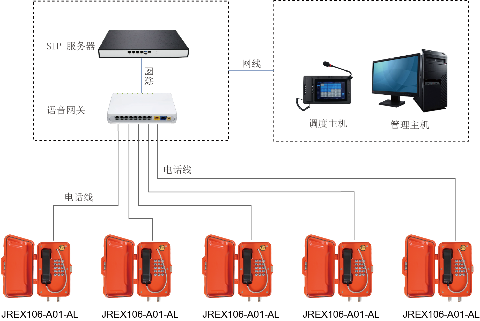 模拟防爆电话连接到语音网关,将模拟信号转换为SIP信号